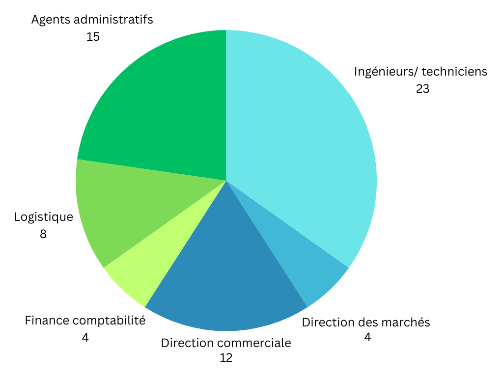 L’entreprise compte 72 employés permanents répartis en plusieurs catégories : 18 ingénieurs et techniciens, 13 personnes dans la direction commerciale, 4 dans les services finance et comptabilité, 18 en logistique, et 15 agents administratifs